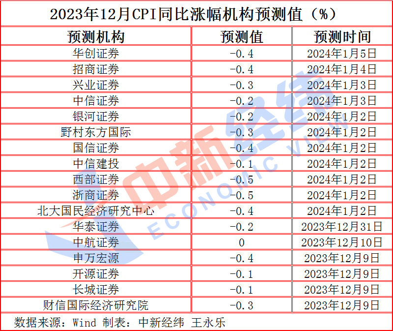 对于即将揭晓的2023年12月CPI数据,Wind数据显示,截至1月11日,17家机构对12月CPI同比涨幅的预测均值为-0.3%。从预测值来看,1家为0%,9家在-0.3%~-0.1%区间,5家为-0.4%,2家为-0.5%,预测值最高为中航证券给出的0%,最低为西部证券、浙商证券给出的-0.5%。若按照机构预测的均值计算,CPI同比降幅将收窄,且连续三个月处于负值区间。