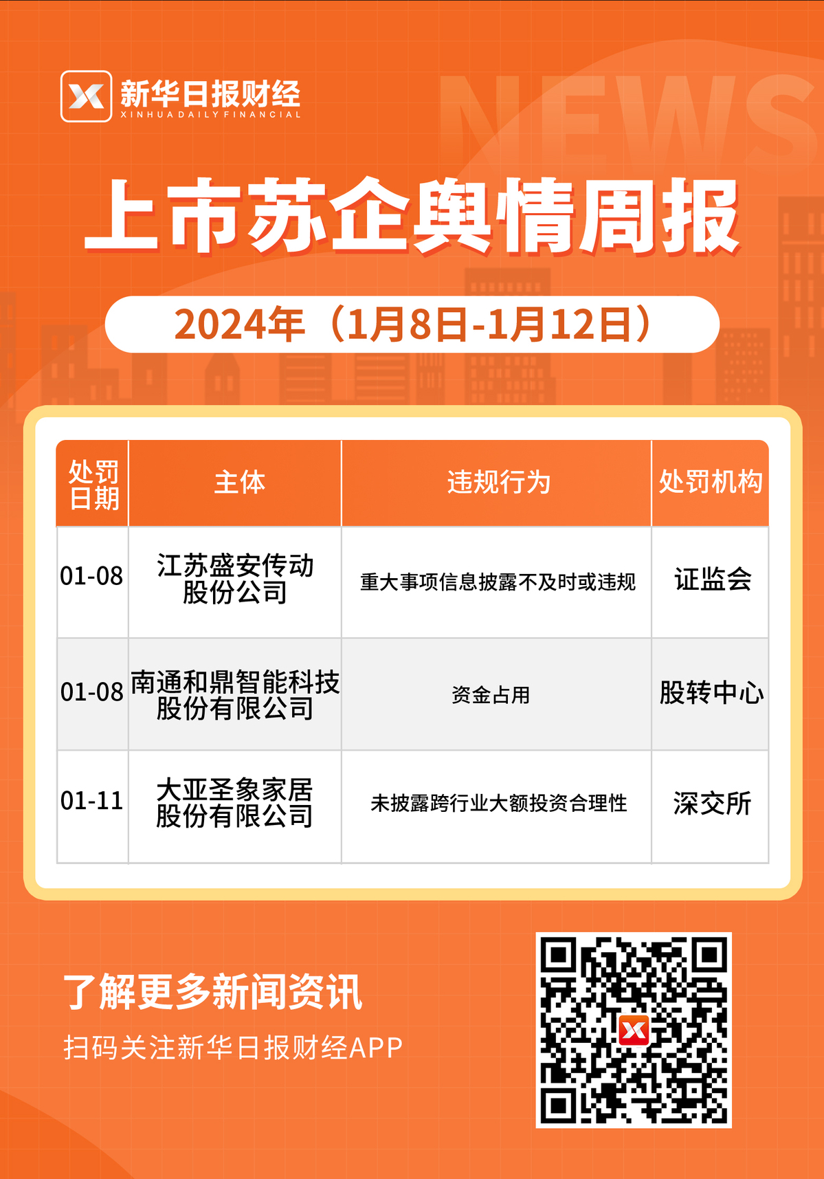 新华日报财经讯 本周(1月8日-1月12日),江苏A股市场共有3家企业因涉及信披和资金占用等问题违规。