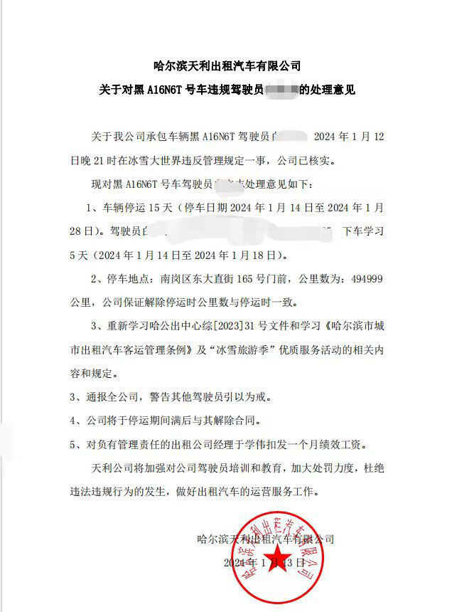 同时,要求天利公司立即整顿,自查自纠、查摆问题;召开全体驾驶员教育整顿大会,把此事件作为警示案例传达到每位驾驶员,杜绝类似事件发生,确保冰雪旅游季优质运营。行业管理部门将此次事件记入出租汽车企业经营服务考核系统,扣除企业相应分值。如果涉事企业再发生1起违法违规舆情事件,将按有关规定,停止办理涉事公司的更新业务和驾驶员上车业务。