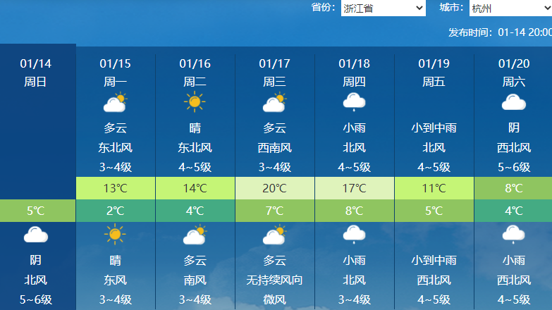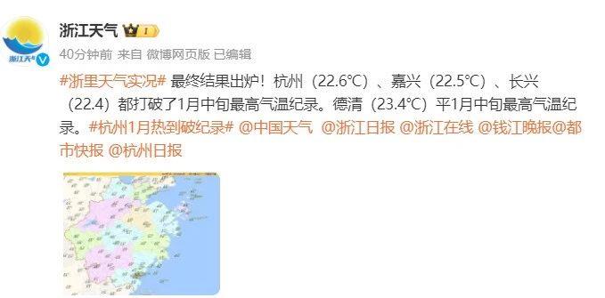 像是杭州,今天最高气温22.6℃,刚刷新当地1月中旬最高气温纪录,明天气温陡降,虽预报最高气温14℃,但今晚开始气温倒出,实际明天下午最高气温将不足10℃,17日气温再度升至20℃,大幅偏高,20日又降至8℃。