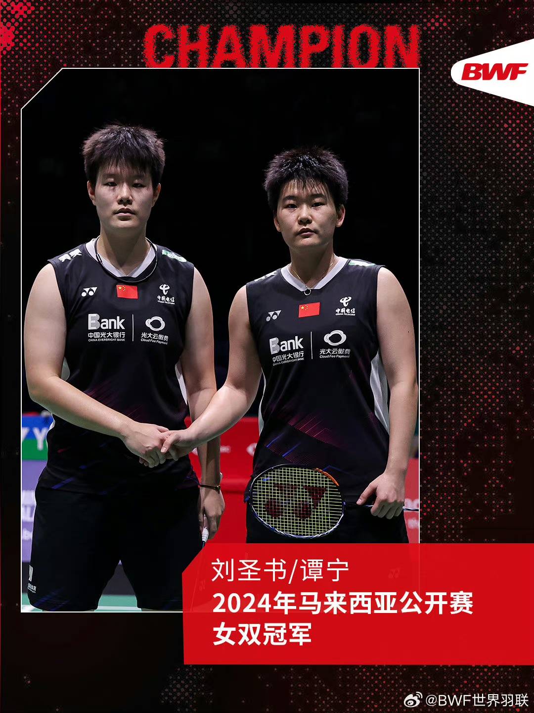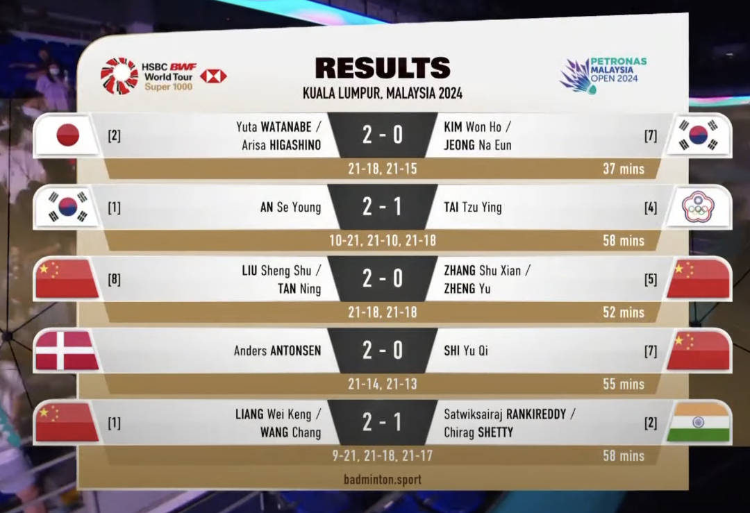 1月14日,世界羽联世界巡回赛马来西亚公开赛在吉隆坡结束所有项目争夺,中国队在女双、男双和男单项目上收获2金2银。当日,中国队女双组合刘圣书/谭宁以2-0战胜队友张殊贤/郑雨,两对选手包揽冠亚军。梁伟铿/王昶以2-1战胜印度队兰基雷迪/谢提夺得男双冠军。男单决赛,石宇奇以0-2负于丹麦队选手安东森获得亚军。