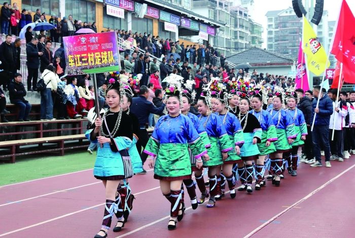 1月6日,在贵州省榕江县“村超”球场,啦啦队巡游入场 新华社图