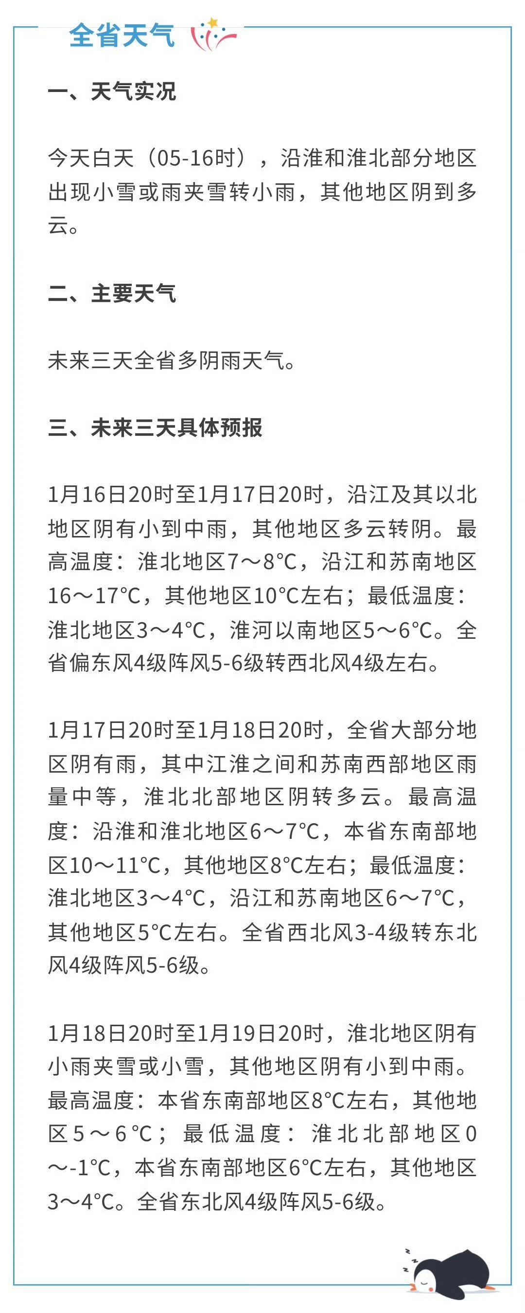 1月16日20时至1月17日20时,沿江及其以北地区阴有小到中雨,其他地区多云转阴。最高温度:淮北地区7~8℃,沿江和苏南地区16~17℃,其他地区10℃左右;最低温度:淮北地区3~4℃,淮河以南地区5~6℃。全省偏东风4级阵风5-6级转西北风4级左右。