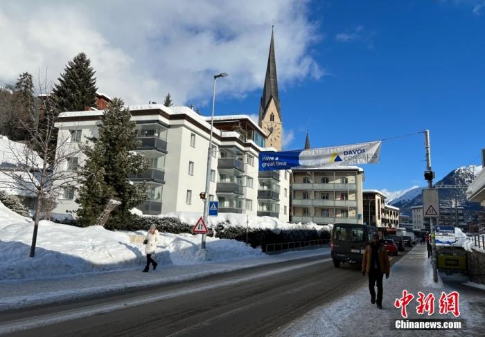 资料图:当地时间1月15日,达沃斯街道上挂起会议相关景观装饰。