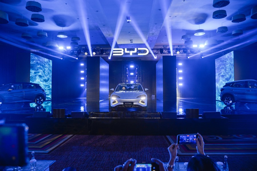 New cars are shown on the stage during BYD grand launch in Jakarta, Indonesia, Jan. 18, 2024. China's BYD, a global leader in the sale of pure electric vehicles (EV), launched three new electric passenger cars, SEAL, Atto 3, and Dolphin, in Jakarta, Indonesia on Thursday to further expand in the Southeast Asia region. (Xinhua/Xu Qin)