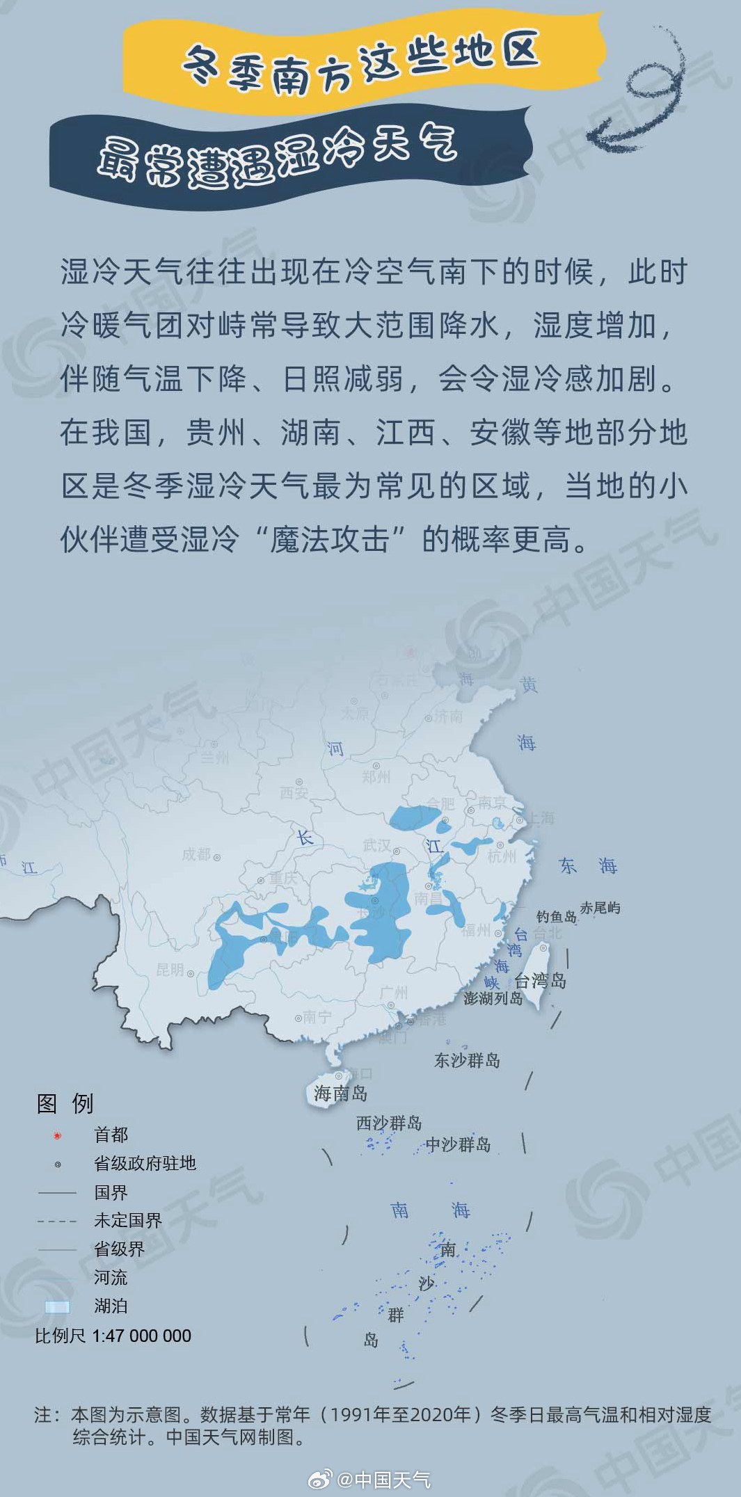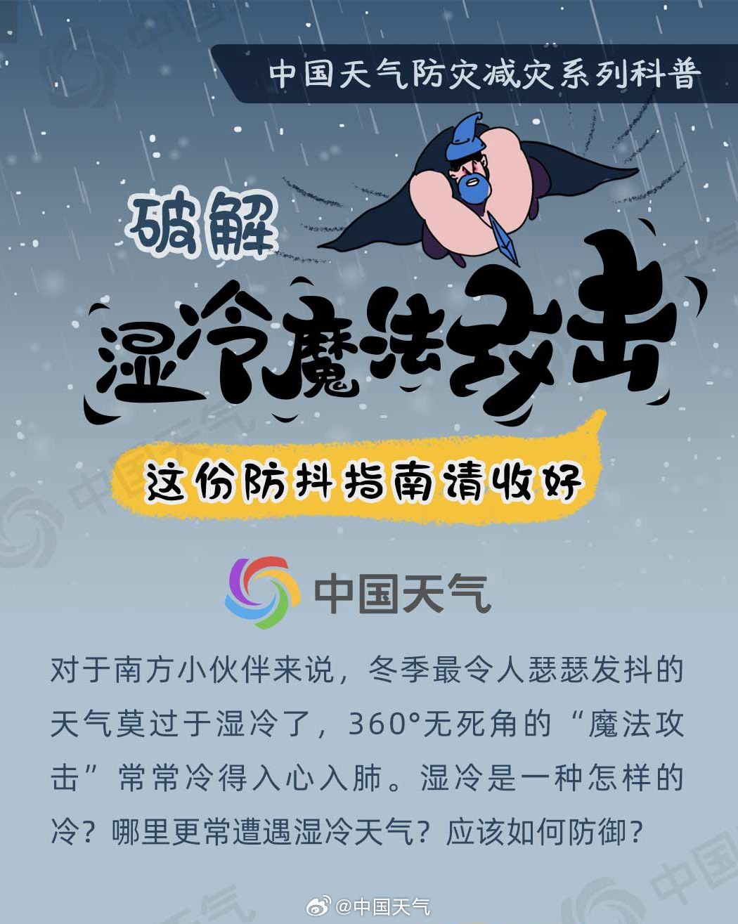 眼下,2024年首场寒潮天气正在影响我国,南方多地遭遇今冬来强度最强、范围最广的雨雪天气。今天(1月22日)早晨,最低气温0℃线已南压至贵州南部至江西北部一线,低温叠加雨雪,南方人熟悉的湿冷“魔法攻击”上线了。湿冷到底是一种怎样的冷?该如何防御?@中国天气 推出防灾减灾系列科普之湿冷防御指南,看看如何破解湿冷“魔法攻击”。
