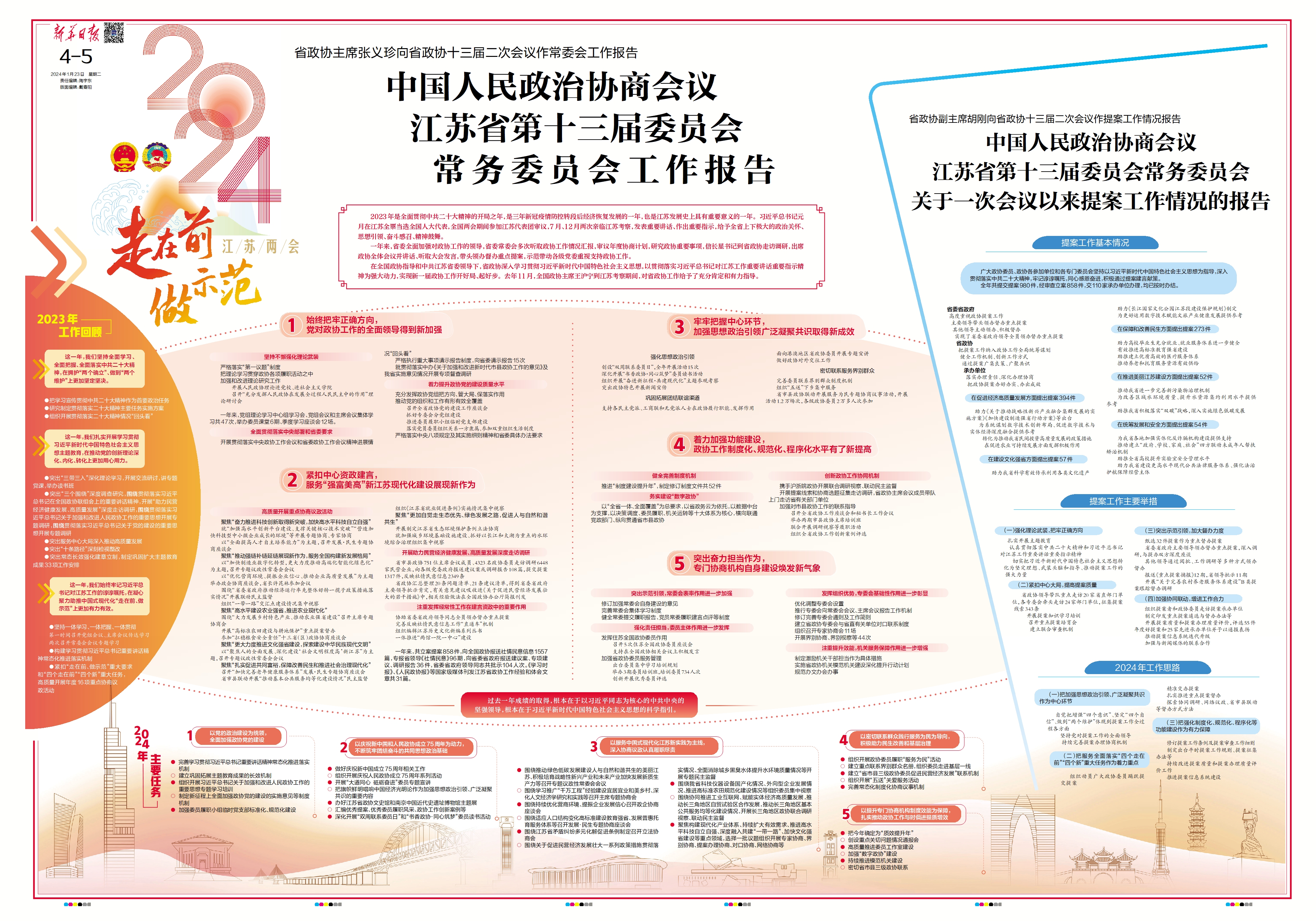 2023年是全面贯彻中共二十大精神的开局之年,是三年新冠疫情防控转段后经济恢复发展的一年,也是江苏发展史上具有重要意义的一年。习近平总书记元月在江苏全票当选全国人大代表,全国两会期间参加江苏代表团审议,7月、12月两次亲临江苏考察,发表重要讲话、作出重要指示,给予全省上下极大的政治关怀、思想引领、奋斗感召、精神鼓舞。