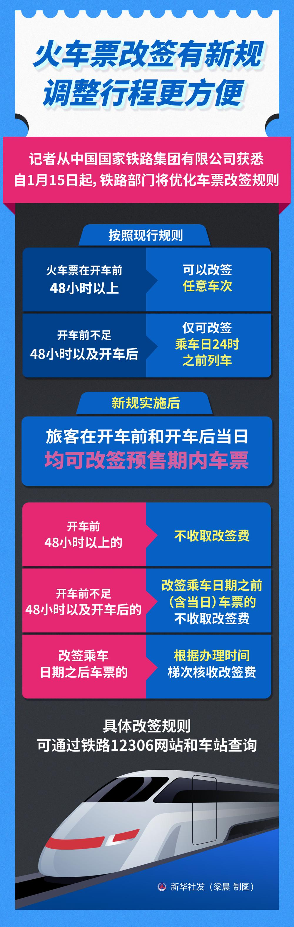 自1月15日起,铁路部门将优化车票改签规则,扩大车票改签范围,旅客在开车前和开车后当日均可改签预售期内车票,进一步便利旅客购票出行。