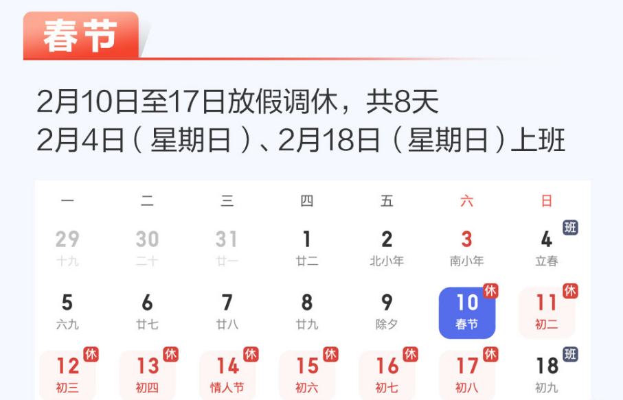 需要注意的是,下周日即2月4日,以及2月18日上班。