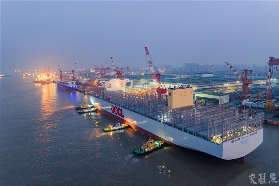 1月9日早晨,世界上最大2.4万标箱级“中远川崎396”轮集装箱船在南通、常熟、太仓三地海事部门的护航下,顺利离开长江南通段出江试航。该船是中国船厂自主研发设计的新一代超大型集装箱船的优秀代表,同时也是世界最大级别绿色环保型集装箱船。孔玮 摄 视觉江苏网供图