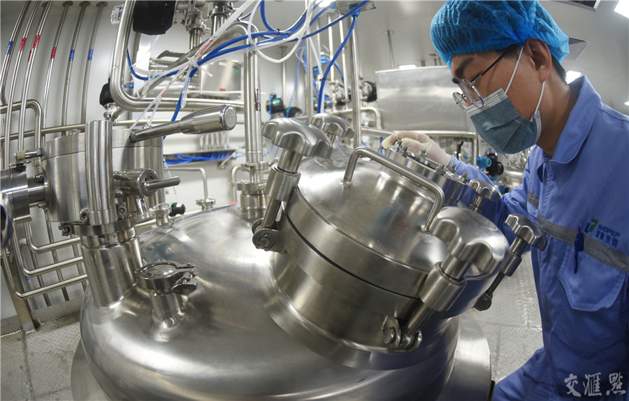 1月15日,连云港经济技术开发区中华药港一家生物制药企业的工人在多肽生产车间查看设备运行情况。近日,该公司连云港工厂第三代多肽生产车间正式联线投产。耿玉和 摄 视觉江苏网供图