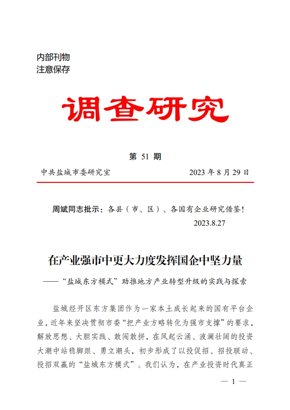 总结提炼的以投促招、招投联动、投招双赢的“盐城东方模式”一文在市委《调查研究》上登载,集团重点工作首次获得市委主要领导批示肯定,要求各县(市、区)、各国有企业研究借鉴,并在全市高质量发展观摩会上印发,产生轰动效应。(陈林 成芳)