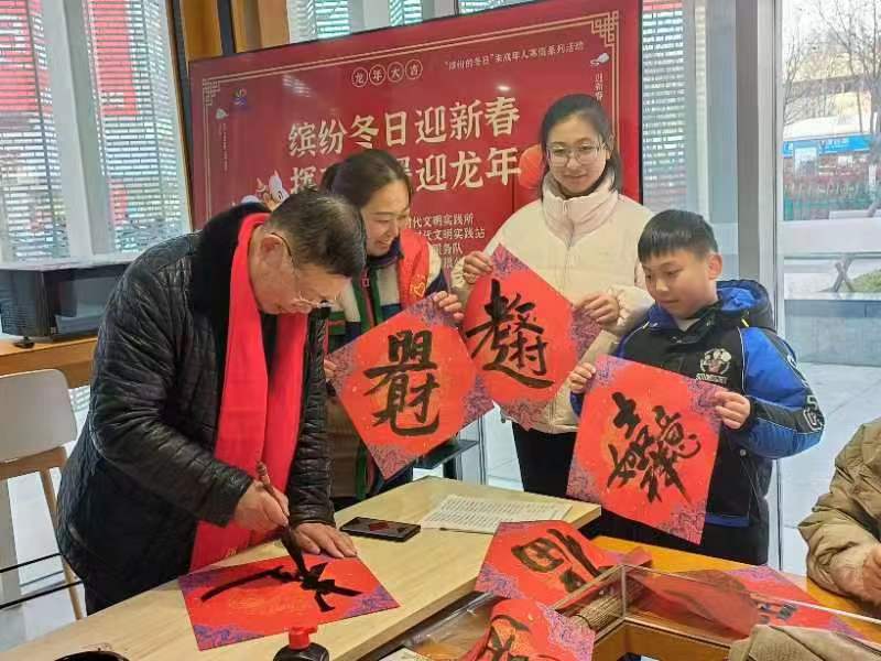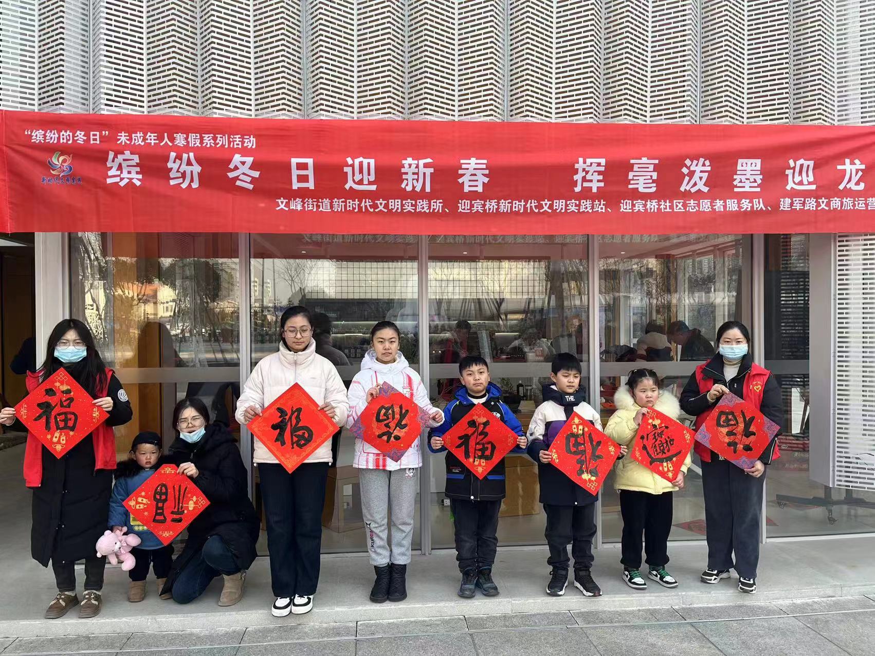 1月27日,文峰街道新时代文明实践所、迎宾桥社区党委、社区新时代文明实践站、纪委、关工委、社区志愿者服务队、建军路文商旅运营有限公司携手盐城市老干部书画联谊会在澄赢小筑开展了“缤纷冬日迎新春,挥毫泼墨迎龙年”写春联、送祝福活动。活动在喜乐融融的氛围中不仅弘扬了中华优秀传统文化,表达新年祝福,营造喜庆、欢乐、祥和的节日气氛,还丰富辖区未成年人假期的文化生活。