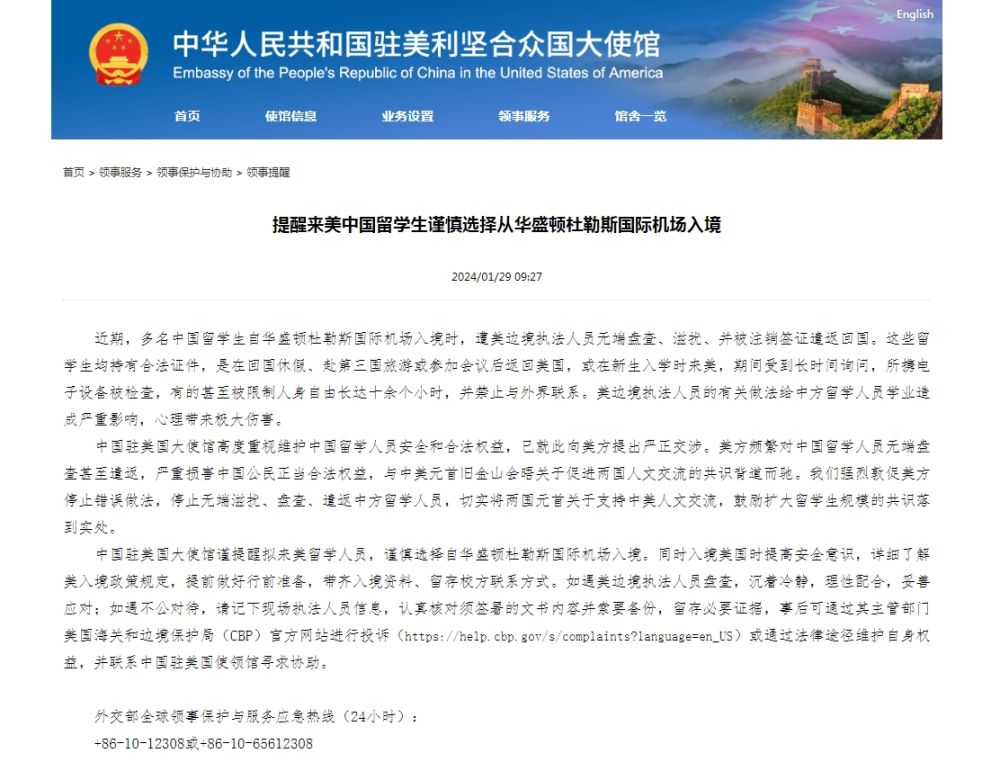 中国驻美大使馆29日也在声明中说,近期,多名中国留学生自华盛顿杜勒斯国际机场入境时,遭美边境执法人员无端盘查、滋扰、并被注销签证遣返回国。这些留学生均持有合法证件,是在回国休假、赴第三国旅游或参加会议后返回美国,或在新生入学时来美,期间受到长时间询问,所携电子设备被检查,有的甚至被限制人身自由长达十余个小时,并禁止与外界联系。