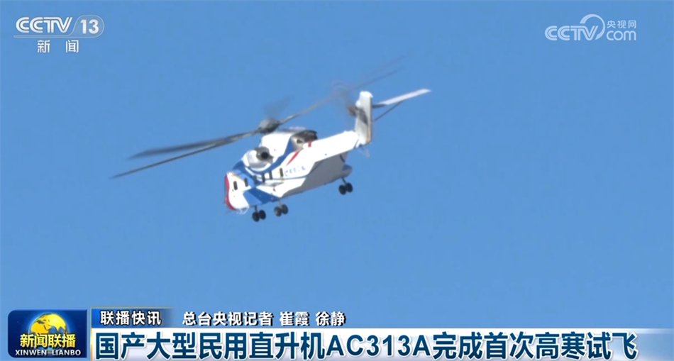 航空工业集团1月31日宣布,我国自主研制的大型民用直升机AC313A在漠河完成了首次高寒试飞,对直升机极限飞行速度、动力系统的低温启动试验等进行了验证。AC313A直升机可满足我国全疆域范围内的森林消防、搜索救援等多领域使用要求。