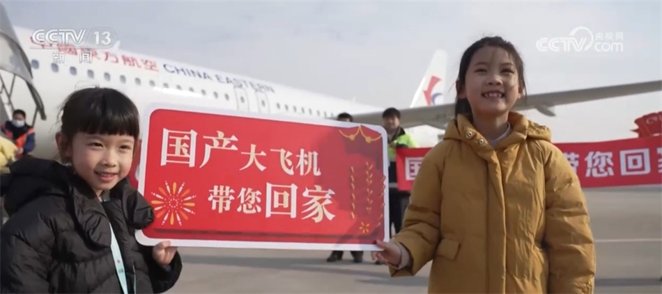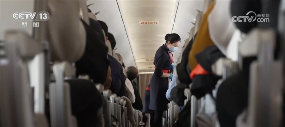 机上广播:我们乘坐C919,从上海到成都,从繁花之地到大熊猫家园,让我们和C919开启一段新春旅程。