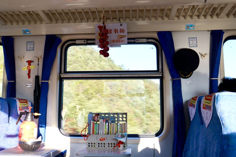 列车里还设有读书角,书架上,摆着许多农业种植、养殖技术相关的书籍,乘客可以随时取阅。
