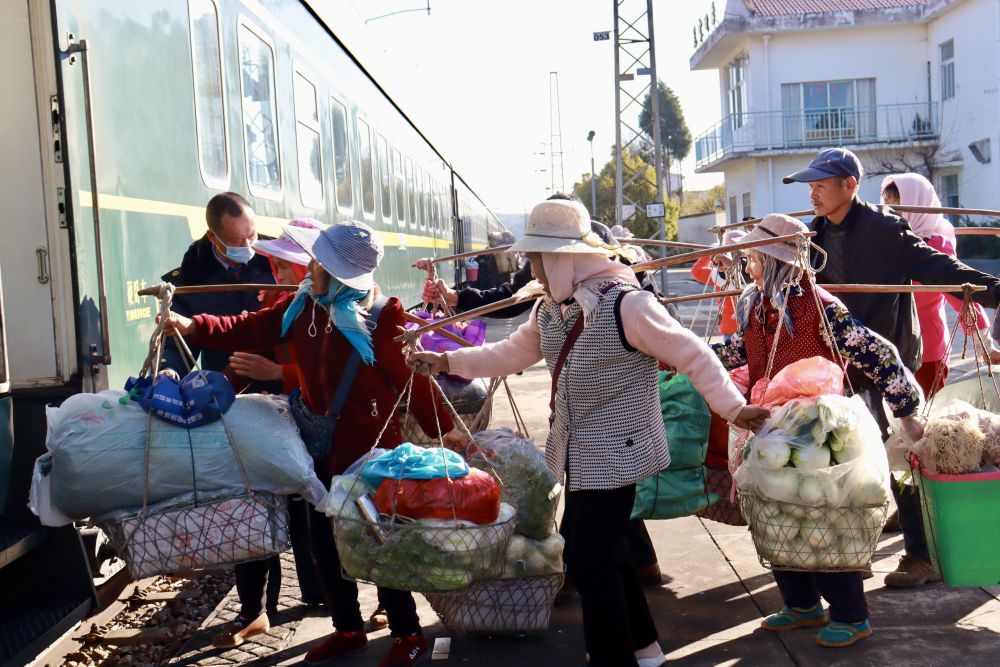 列车刚到云南省曲靖市马龙区吴官田站,路边挑扁担、背背篓的菜农已在等待车门开启。