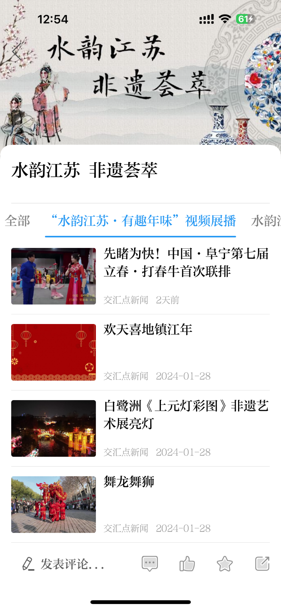 将龙年春节过得“够味儿”,除实地体验丰富多彩的“水韵江苏·非遗陪你过大年”系列线下活动,还可以通过“屏端”在线感受江苏各地精彩非遗活动带来的浓浓年味。2月4日起,江苏非物质文化遗产网站和交汇点新闻客户端同步上线“水韵江苏·有趣年味”视频展播专栏,通过镜头记录,视频集中展播,让公众了解江苏与春节有关的年俗非遗项目,展示近年来年俗项目保护传承成果,提升人民群众对“年文化”相关活动的兴趣和关注度。