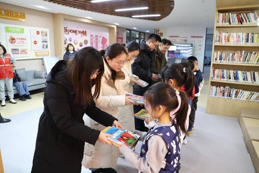 交汇点讯 2月4日下午,一场全民阅读春风行动在南京市建邺区兴隆街道乐山路社区展开。南京河西新城管委会(以下简称河西管委会)组织党员志愿者将数百本经典书籍和青少年读物送到社区图书室,正在图书室看书的孩子们欣喜地收到“立春”礼物。