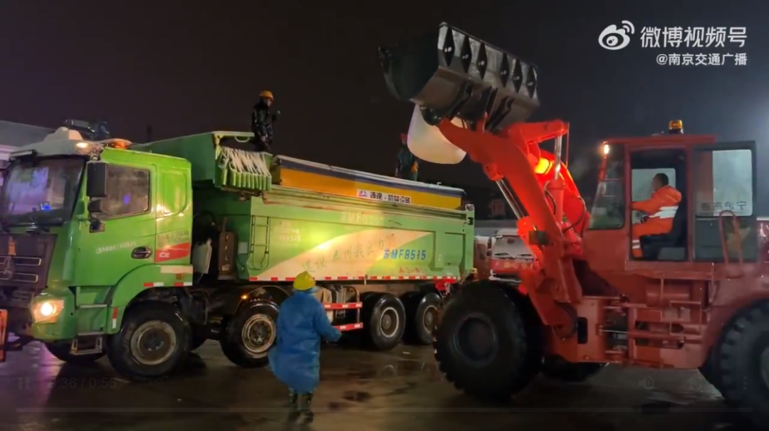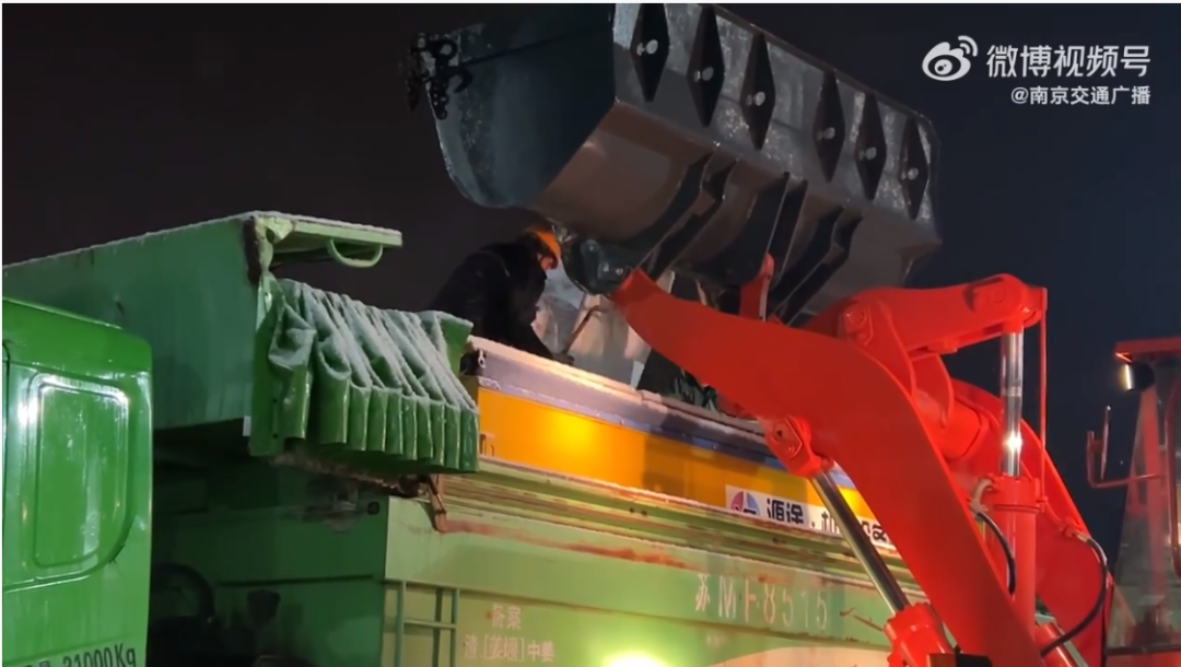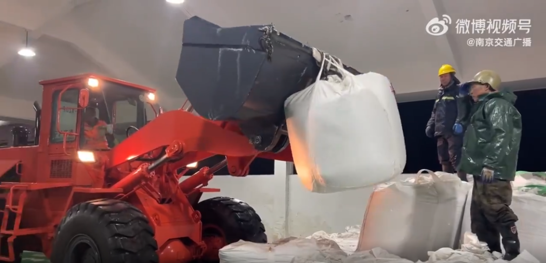 继2月4日傍晚六点沪宁高速主线及连接线第一遍融雪剂撒布作业后,随着雨雪越下越大,沪宁高速晚上十点开始新一轮融雪作业。首先使用吹雪车对积雪路段进行作业,然后进行融雪剂撒布。作业车刚刚装载完毕所需的融雪剂,据了解,一辆车大概会装载8包融雪剂,1包1吨,一次作业消耗8吨。