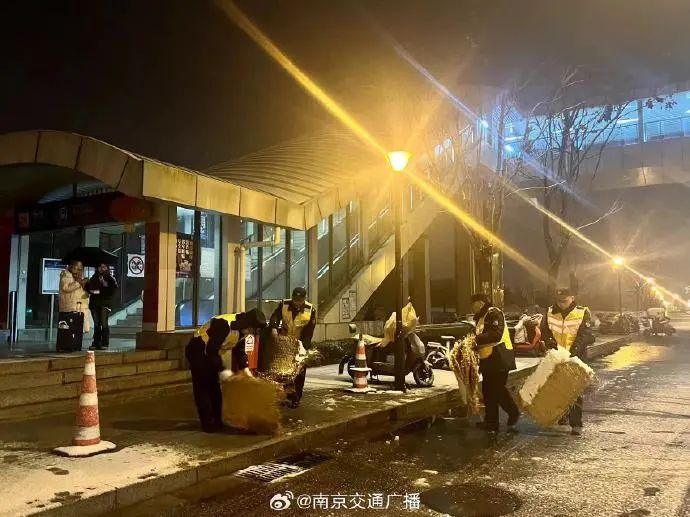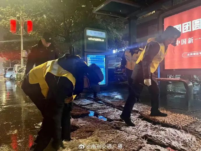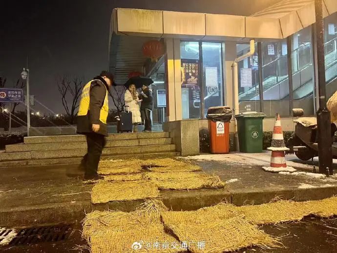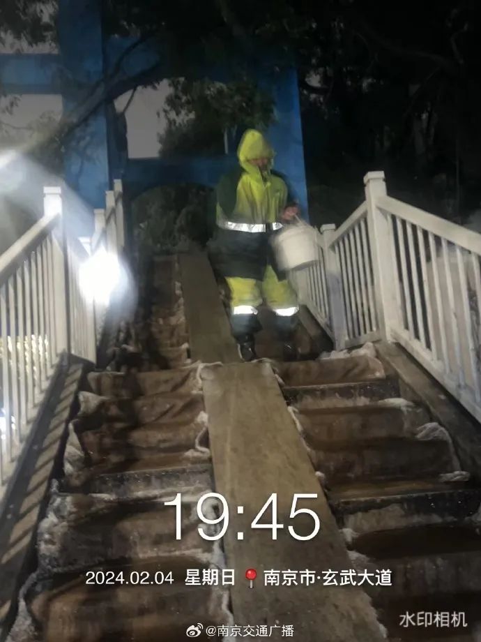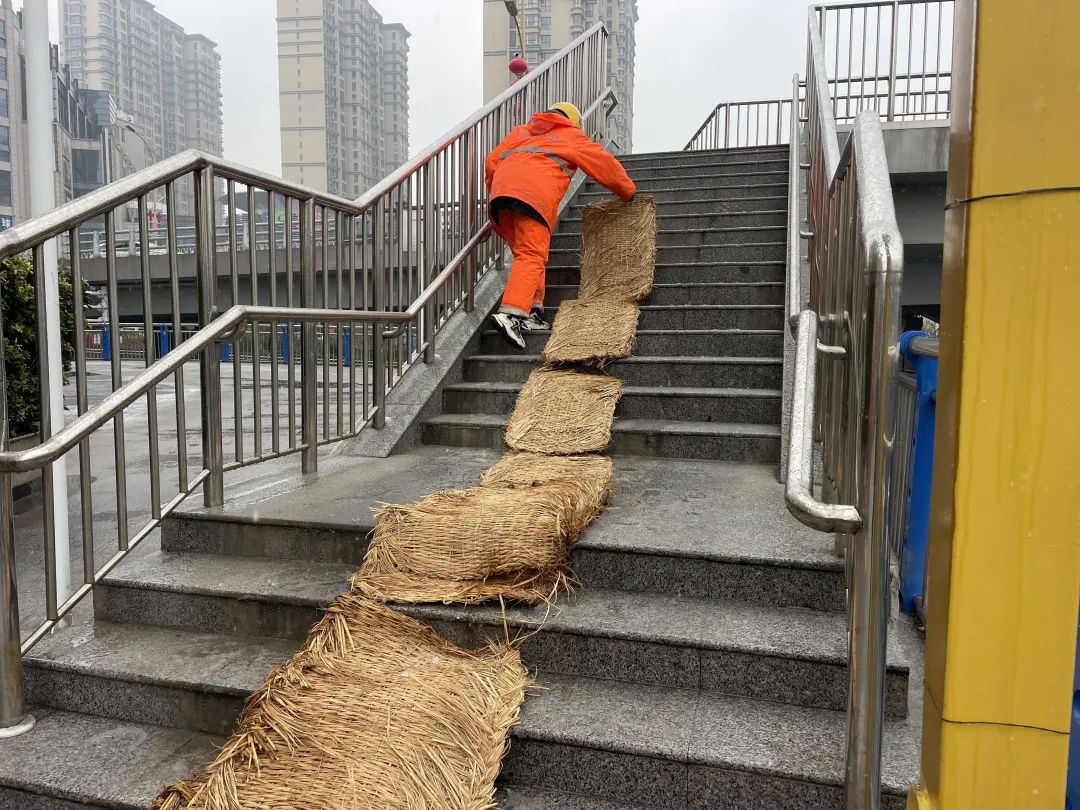 玄武区城管部门在人行天桥、跨线桥撒融雪剂,公厕铺设防滑草垫。