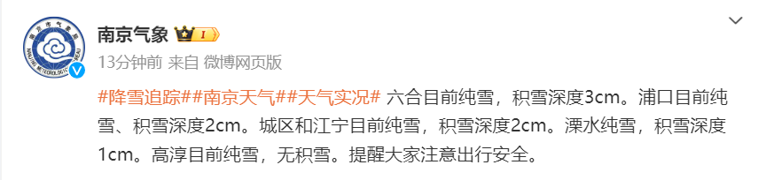 六合2月4日夜里纯雪,积雪深度3cm。浦口纯雪、积雪深度2cm。城区和江宁纯雪,积雪深度2cm。溧水纯雪,积雪深度1cm。高淳纯雪,无积雪。请大家注意出行安全。