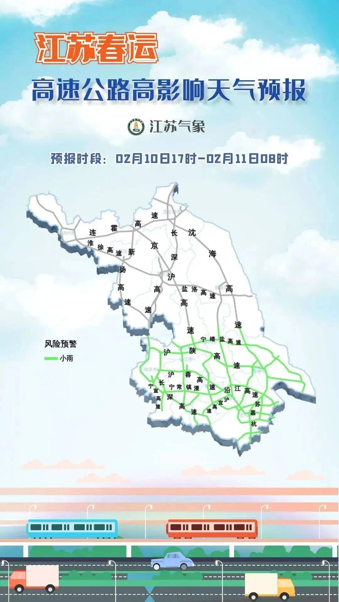 2月10日17时至2月11日08时,淮河以南地区多云转阴有小雨,其他地区晴转多云到阴。受小雨影响的高速主要有:宁靖盐高速、沪陕高速、沪蓉高速、沿江高速、宁常镇溧、苏嘉杭等。
