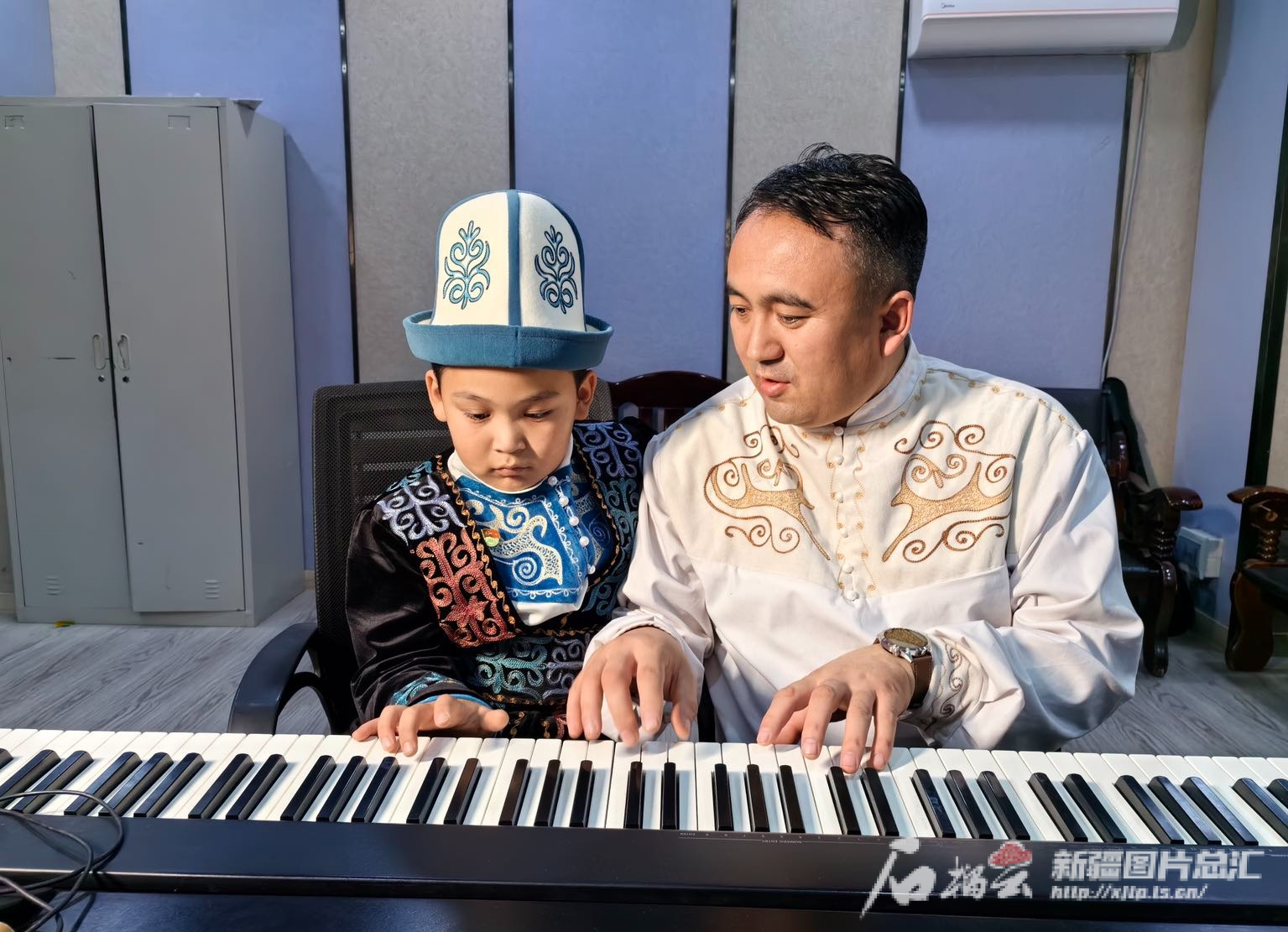 梅肯在音乐氛围浓厚的家庭中长大,爸爸就是启蒙老师。“我在家里每天都会弹琴唱歌,梅肯很小时就咿咿呀呀地跟着我唱,传承本来就不是刻意的,它是自然而然发生的。”买买提吐尔干说,家里的库姆孜、木口弦、钢琴都是梅肯和他的“亲子游戏道具”。