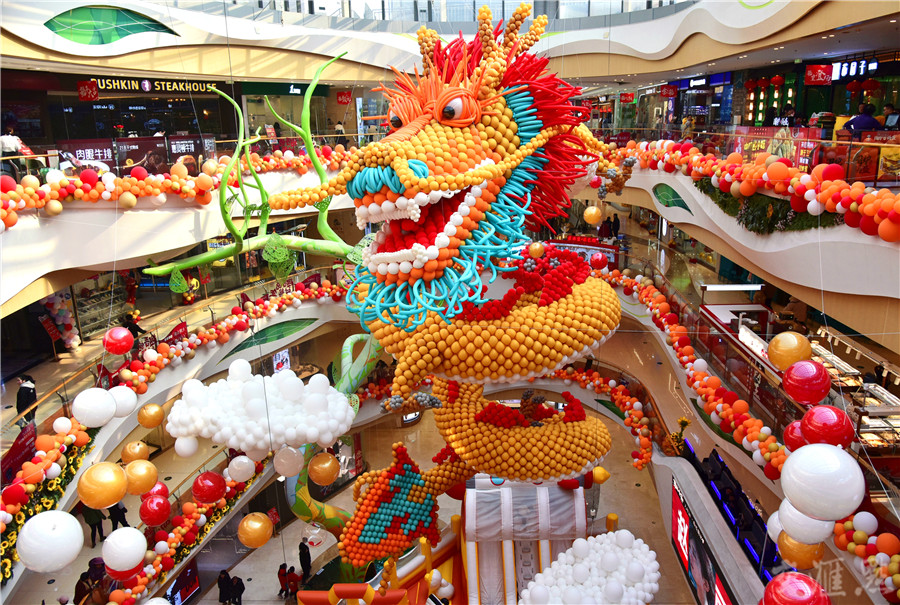 2月10日,如皋市城区一家大型商场内,用数千只彩色气球制作的“中国龙”给新年倍增喜气,吸引不少市民购物、赏景。吴树建 摄 视觉江苏网供图