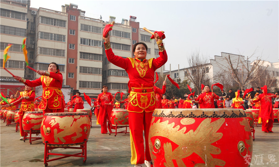 2月10日,徐州市铜山区茅村镇在新时代文明实践所前广场举办“百面大鼓闹新春”活动,欢乐喜庆过新年。蒯创 摄 视觉江苏网供图