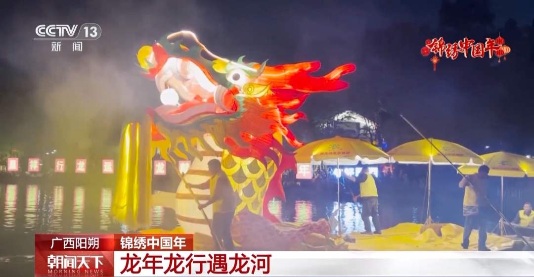 为迎接农历新年的到来,2月10日傍晚,在广西阳朔县风景秀丽的遇龙河上,90张竹筏收尾相连,在渔火的映照下,组成一条长约800米“巨龙”。蛟龙出水,在河面上蜿蜒游弋,空中烟火阵阵,如梦似幻,形成一道独特的壮丽景观。当晚的“巨龙巡游”及迎新春表演持续了一个多小时,吸引了两万多名游客驻足观赏,感受着新春的欢乐气氛。