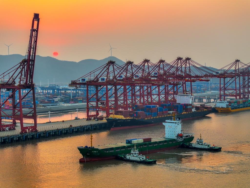 2024年2月11日,宁波舟山港金塘港区船来船往,码头作业繁忙(无人机照片)。新华社发(姚峰摄)