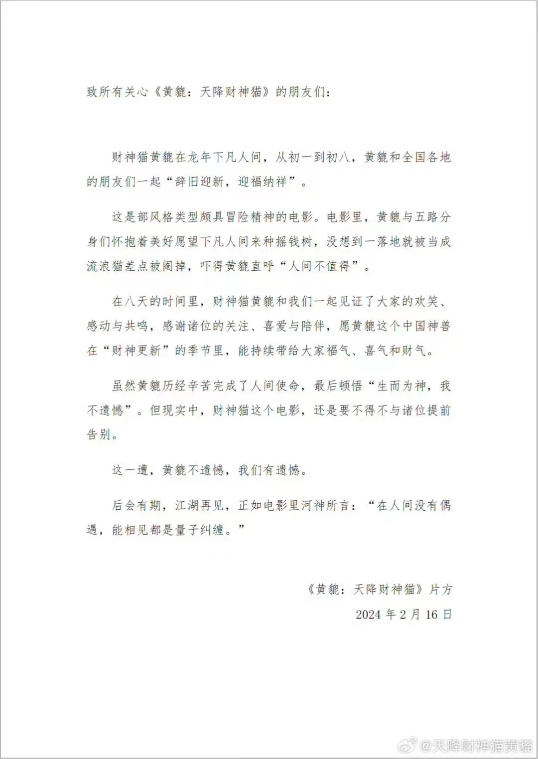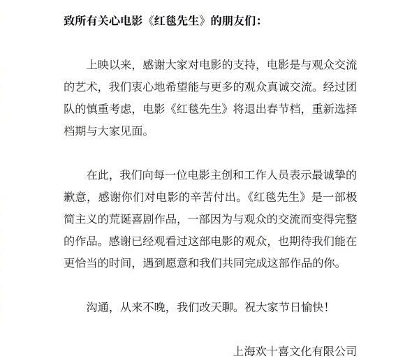 此前2月14日,韩延导演、彭昱畅李庚希主演的《我们一起摇太阳》宣布改档到3月30日再上映,动画电影《黄貔:天降财神猫》则在2月16日宣布“后会有期,江湖再见”。