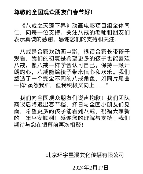 2月17日,@八戒之天蓬下界 微博发布声明,宣布电影《八戒之天蓬下界》将退出春节档。