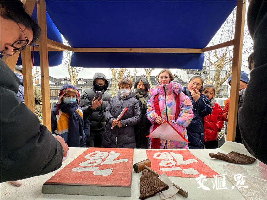 2月5日苏州市十全街迎新春年俗文化活动现场,外国友人饶有兴致地观看中国传统文化技艺“福字拓印”。马耀明 摄 视觉江苏网供图