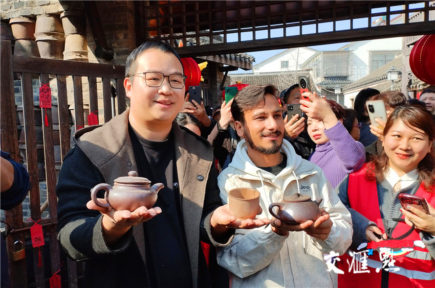 图为留学生与龙窑窑工展示刚刚出窑的紫砂壶、紫砂杯。丁焕新 摄 视觉江苏网供图