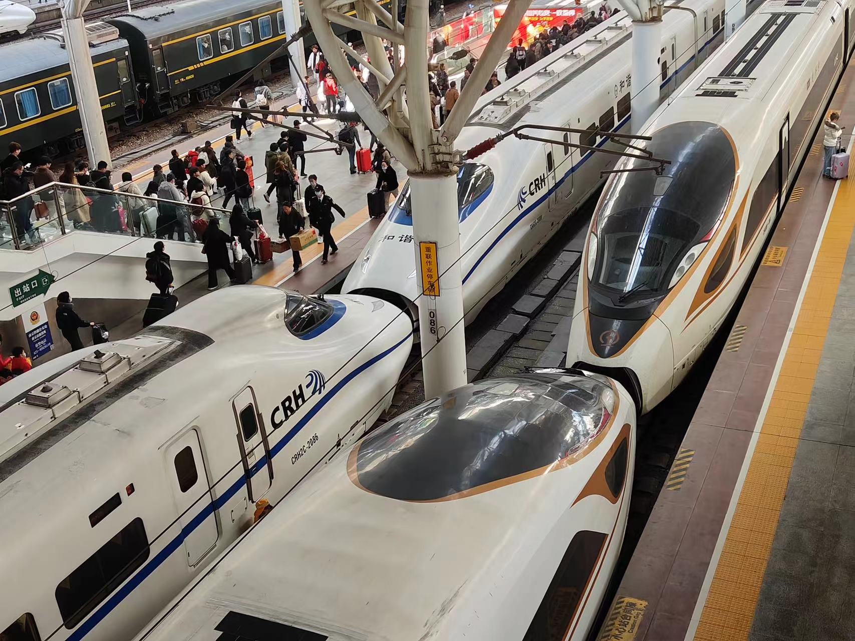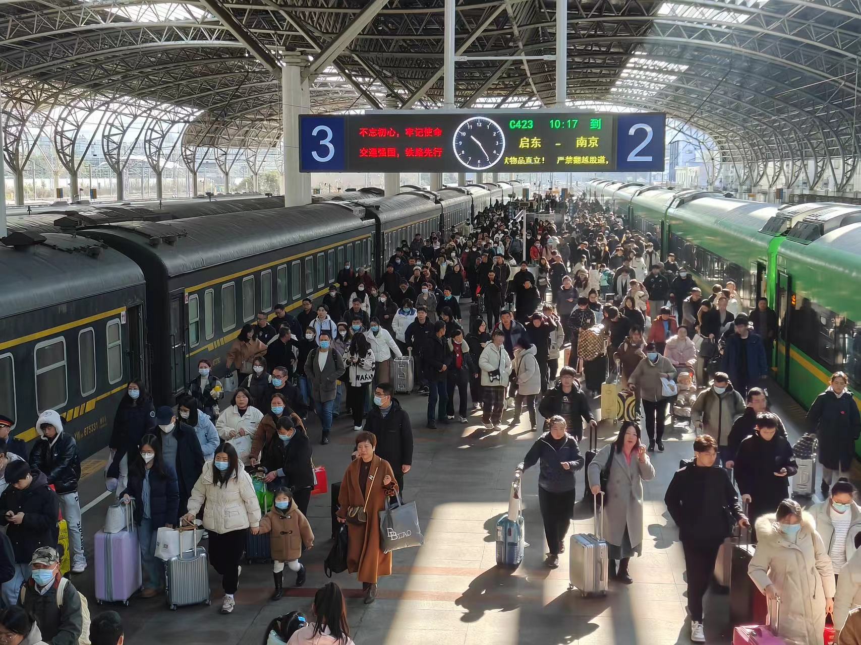 交汇点讯 2月18日,记者从中国铁路上海局集团有限公司获悉,截至2月17日,2024年春节假期正式落下帷幕,长三角铁路假期8天发送旅客逾1700万人次,日均发送旅客在215万人次以上,较2019年同期增幅超六成。2月18日(正月初九)是假期后的第一个工作日,今天长三角铁路预计发送旅客252万人次,计划增开旅客列车443趟,对178趟动车组列车进行重联编组。铁路部门预计,正月十五之前,返程大客流仍将持续。