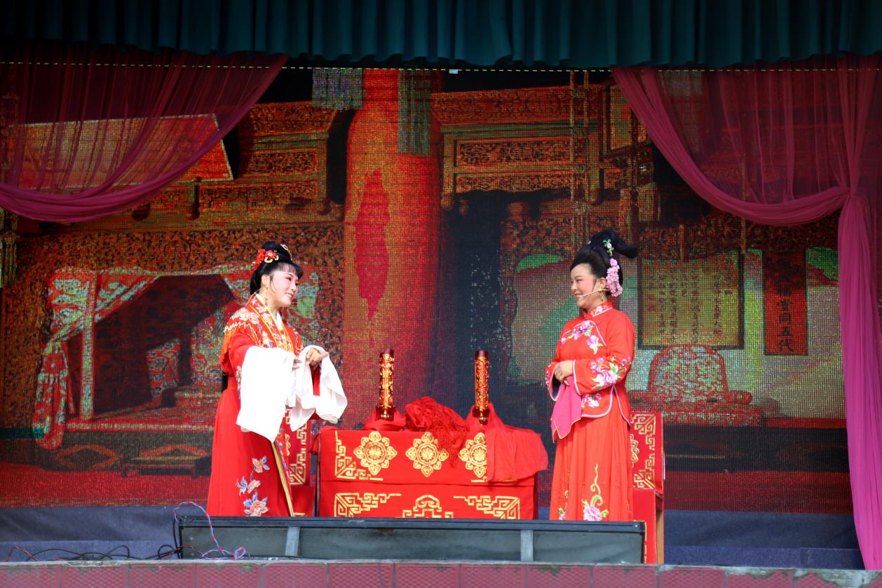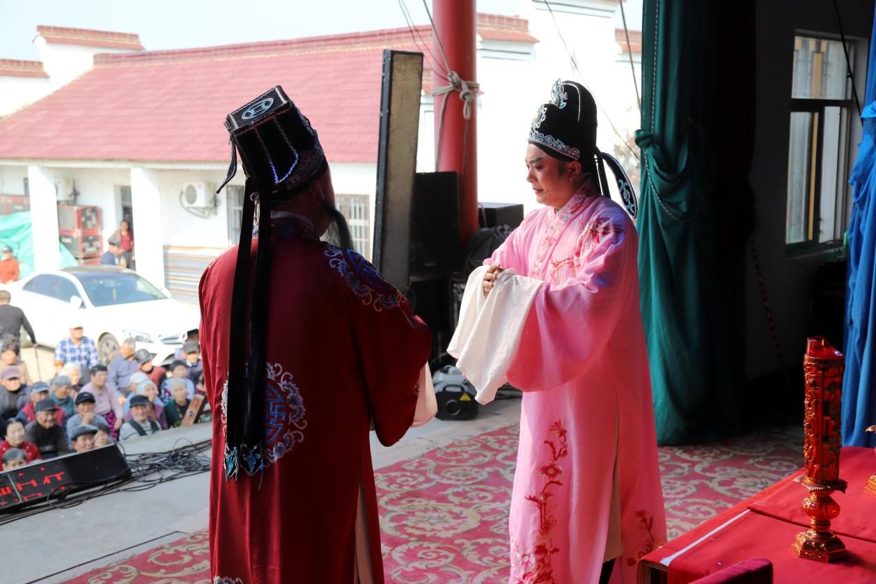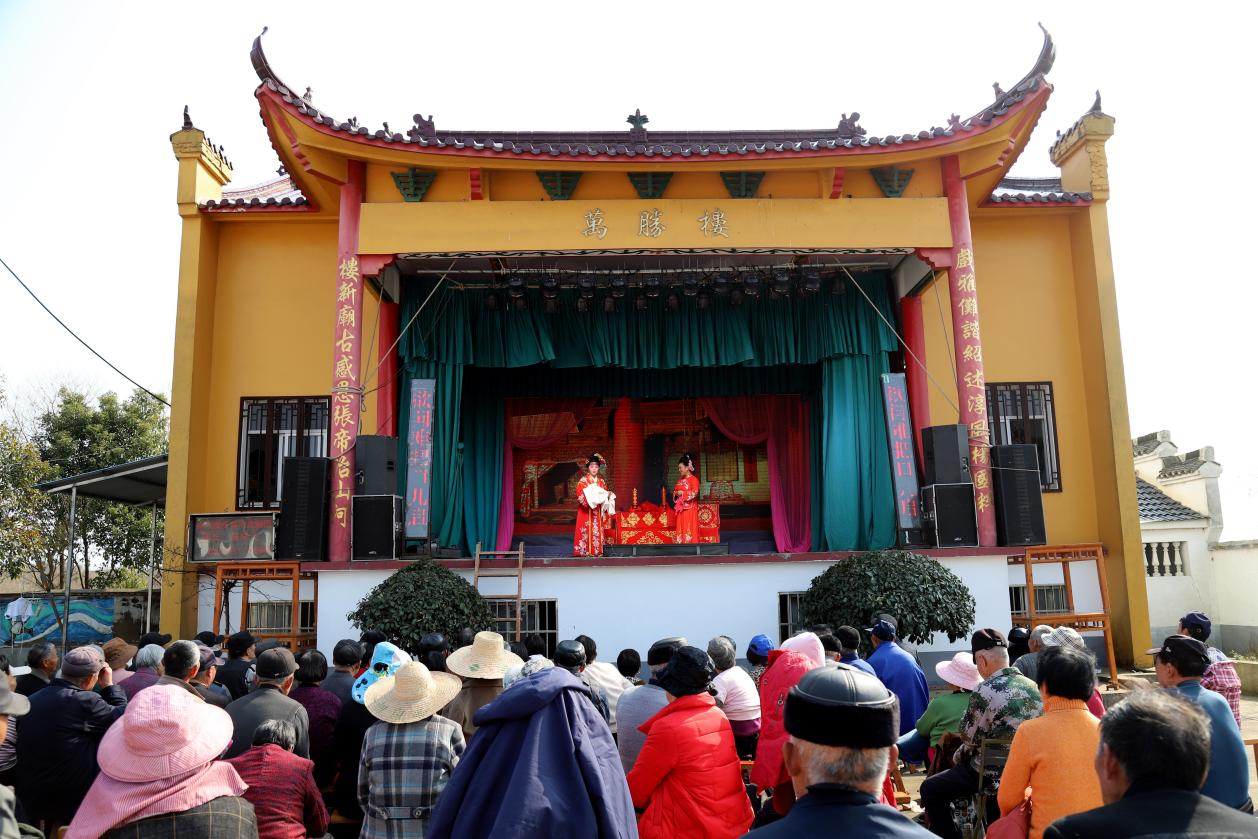戏曲是中华文化的瑰宝。2月18日,在高淳区桠溪街道芜太村长脉岗自然村戏楼上,演员们正在表演黄梅戏《三凤求凰》。