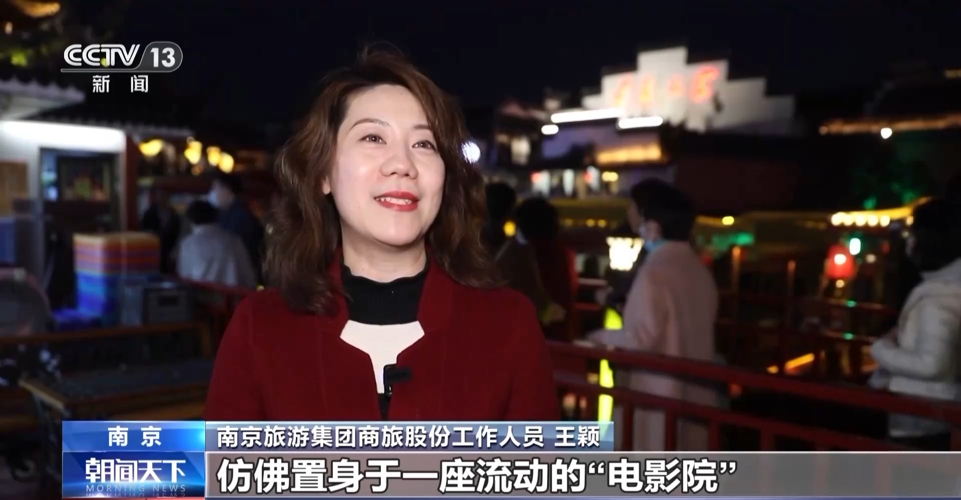 南京旅游集团商旅股份工作人员 王颖:每艘游船上都装有GPS定位系统,再配合沿岸的灯光、投影,让游船在行驶途中仿佛置身于一座流动“电影院”,完整地贯通、复刻“十里秦淮”的历史景象。