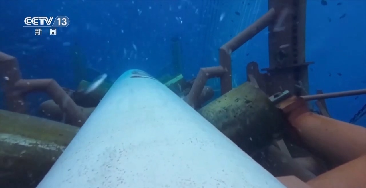 在水下10米深的地方,可以清晰地看到水中黄色的导管架,它们扎根在近百米深的海底,撑起了总重超过4万吨的平台。这些黑色的管线就是气井,正源源不断地从海底开采着天然气。