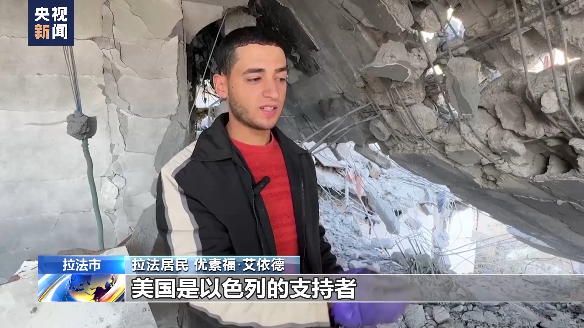 拉法居民 优素福·艾依德:美国是以色列的支持者,从去年10月7日到今天,美国一直为以色列提供炮弹、飞机和坦克,所有这些死亡都是因为美国,因为它想摧毁整个加沙地带。