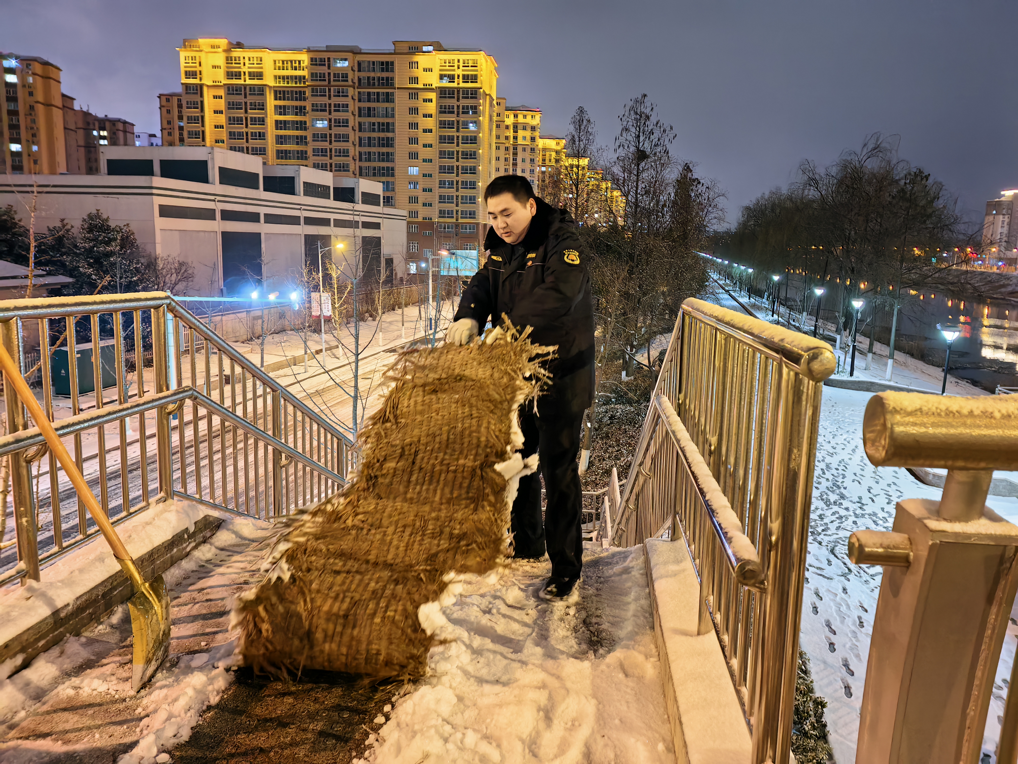 为保障市民安全出行,不少人一夜奋战街头扫雪除冰。六合城管系统近2000人彻夜奋战,持续对地铁站出入口、公交站台、农贸市场、银行、公厕等人群密集区域的桥面、路面等处进行人工扫雪除冰工作,并铺设防滑草垫。