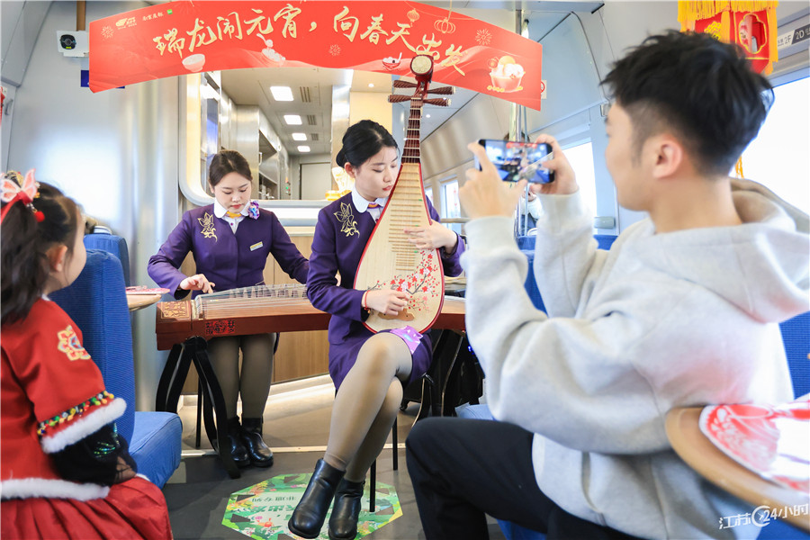 (特约摄影 苏阳 09:07摄 12:38上线)2月23日,“瑞龙闹元宵 向春天出发”活动在江苏南京开往浙江苍南的G7581次“紫金号”高铁列车上举行,扎花灯、猜灯谜等传统民俗项目吸引旅客参加,列车工作人员还为旅客准备了歌舞、器乐演奏等节目,热热闹闹迎接元宵节。