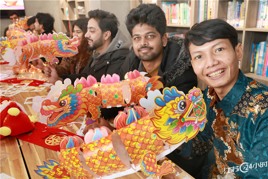 (特约摄影 许丛军 11:27摄 14:23上线)2月23日,“品味崇川”主题中外文化交流活动“中外闹元宵 乐享中国节”在南通大学附属医院文博中心举行,来自俄罗斯、印度、摩洛哥等国家的留学生展才艺、做龙灯、品非遗闹元宵,感受中国传统节日和文化的魅力。