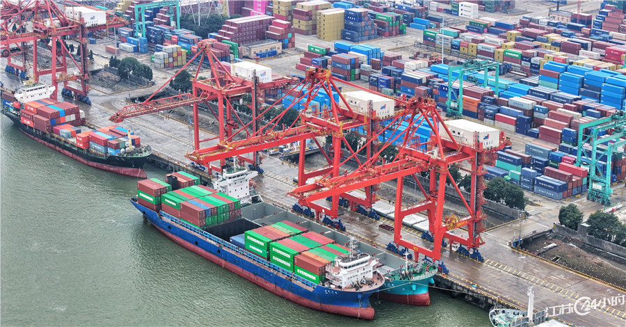 (特约摄影 施柏荣 11:38摄 14:28上线)2月23日,在张家港永嘉集装箱码头,货轮在泊位上有序装卸作业,卡车在堆场上往来穿梭,一派繁忙景象。新春伊始,张家港口岸注重发挥保税区政策和江海联运优势,多措并举提升货物进出港装卸转运效率,港口生产经营有序推进,努力实现新春“开门红”。