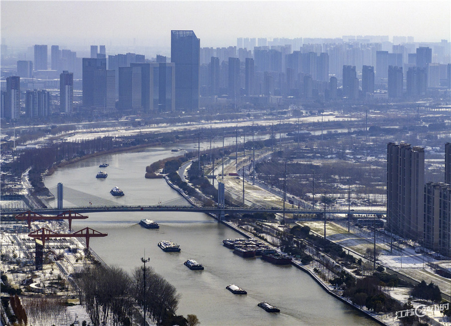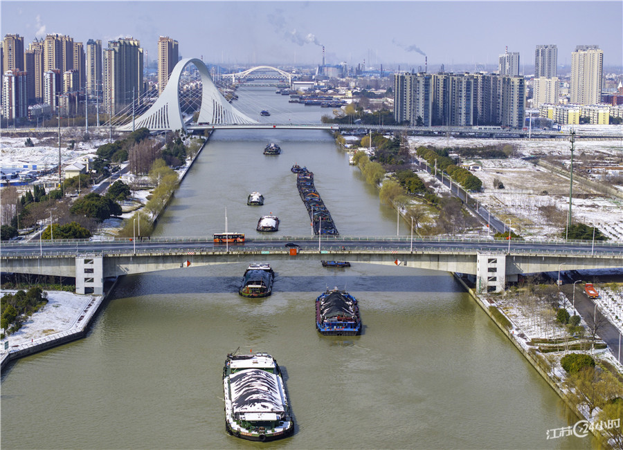 (特约摄影 贺敬华 11:38摄 17:15上线)2月23日,京杭大运河淮安段河道上的运输船舶。初春时节,运输船舶在苏北运河上往返穿梭,呈现一派繁忙景象。
