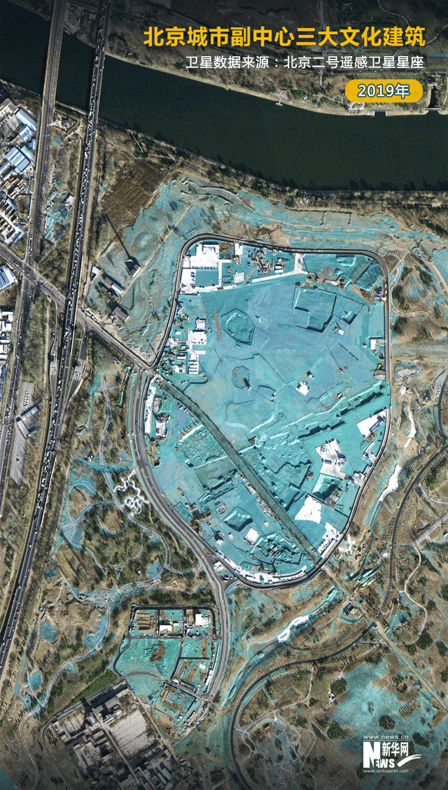 卫星图显示,在皑皑白雪映衬下,北京艺术中心的古粮仓造型格外显眼;北京大运河博物馆的“古韵风帆”意蕴浓厚;北京城市图书馆设计别致,好似“赤印”落于城市绿心的画卷上……