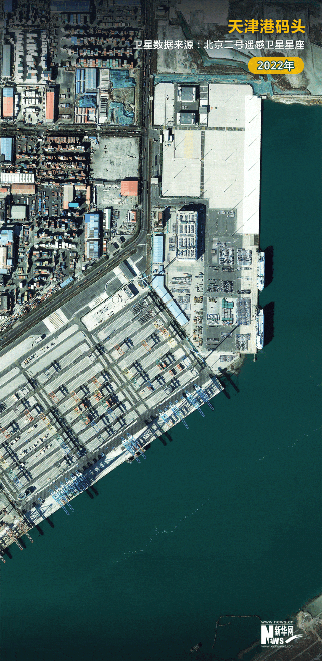 数据显示,天津港2023年完成集装箱吞吐量2217万标准箱,同比增长5.5%,创历史新高。卫星见证,一批批待出口的货物排列在天津港的码头上。我国外贸出口的火热场景跃然图上。