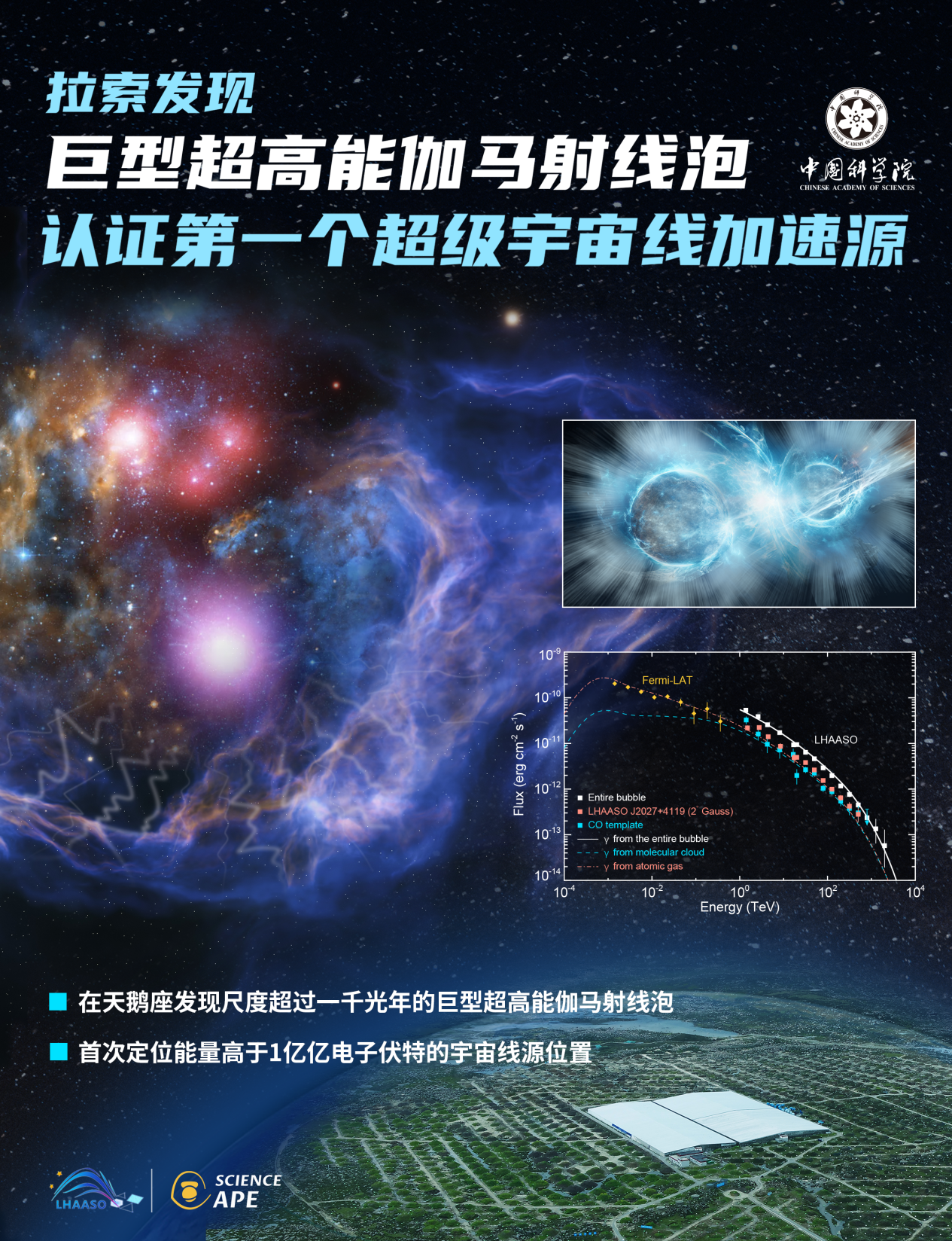 宇宙线,也称为宇宙射线,是从外太空来的带电粒子,宇宙线的起源是当代天体物理学最重大的前沿科学问题之一。今天(2月26日),中国科学院高能物理研究所发布,我国科研人员通过位于四川稻城的高海拔宇宙线观测站(LHAASO,“拉索”)在天鹅座恒星形成区发现了一个巨型超高能伽马射线泡状结构,并在国际上首次认证了能量高于1亿亿电子伏特的宇宙线的起源天体。该成果北京时间2月26日以封面文章的形式在学术期刊《Science Bulletin》(《科学通报》)发表。